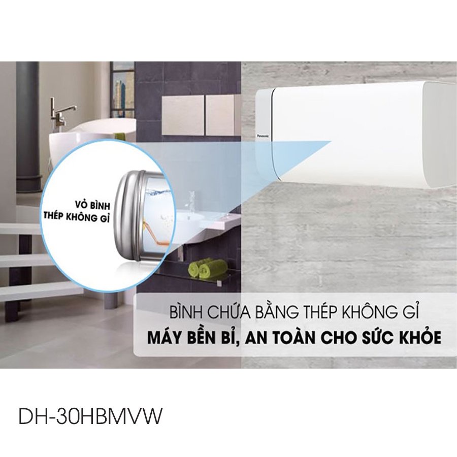 - Máy nước nóng gián tiếp Panasonic DH-30HBMVW có thiết kế chữ nhật ngang đơn giản và trung tính dễ dàng kết hợp với mọi kiểu không gian nội thất của gia đình. Ruột bình chứa được làm từ thép cao cấp cho khả năng chống gỉ bền bỉ. Thanh đốt bằng đồng giúp hiệu quả truyền nhiệt tốt hơn, làm nóng nước nhanh chóng. Thiết bị là một chiếc máy cần thiết cho mọi gia đình, nhất là trong những ngày đông lạnh giá hay những ngày mưa tầm tã.
