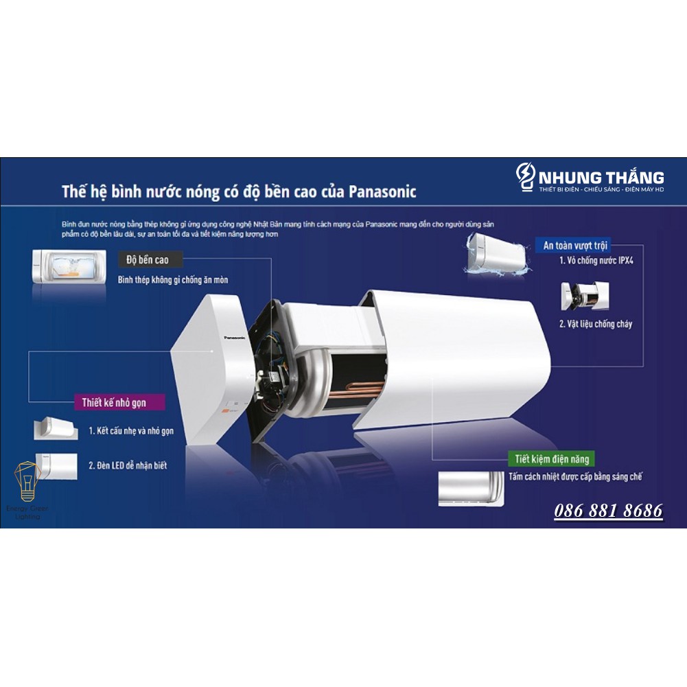 - Công suất hoạt động là 2500W giúp đun nước sôi nhanh, tiết kiệm điện. Bình nóng lạnh Panasonic sử dụng điện áp 220V nên vận hành ổn định hơn. Bình chứa làm từ thép không gỉ chống ăn mòn, chịu được nhiệt độ lên tới 90 độ giúp dự trữ được nước nóng lâu hơn và sạch hơn.