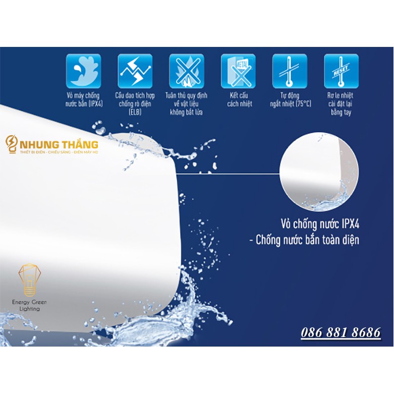- Thanh đốt bằng đồng, xốp cách nhiệt dạng cong giúp giảm thiểu thoát nhiệt. Lớp vỏ thiết kế đạt tiêu chuẩn IPX4 có khả năng chống thấm nước hiệu quả.
