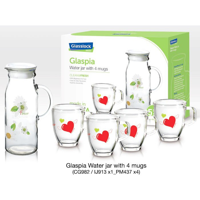 Nhà cửa & Đời sống > Bộ đồ bàn ăn > Bình nước & phụ kiện || Bình nước 1000ml và 4 cốc hoa văn trái tim 370ml GLASSLOCK CG982Còn hàng