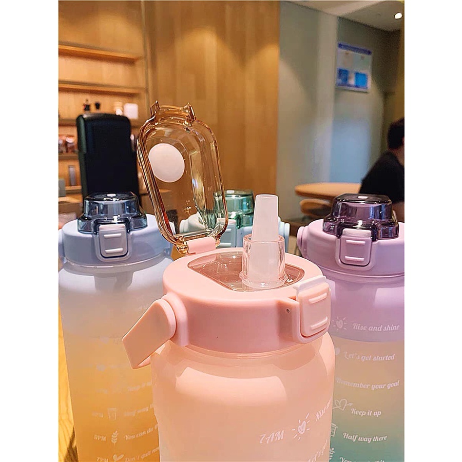 Bình nước 2 lít chia vạch báo giờ uống nước dễ thương cute thể thao có ống hút
