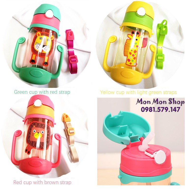 Giới thiệu Bình nước 400ml có quai cầm + dây đeo và kèm ống hút dễ thương cho bé