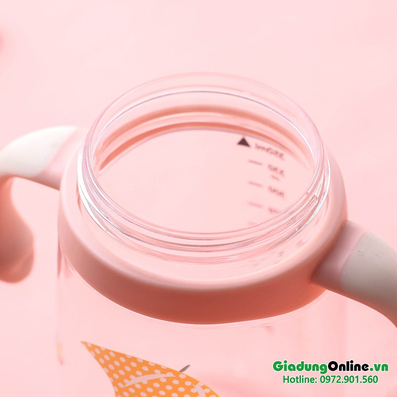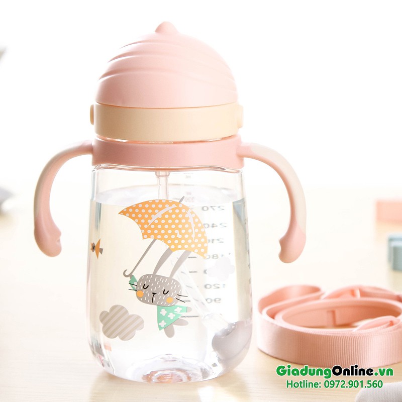 * Bình có ống hút, có tay cầm giúp bé tự cầm uống dễ dàng. Có thể tháo 2 tay cầm bình và nắp dây đeo khi bé mang bình ra ngoài rất tiện lợi.