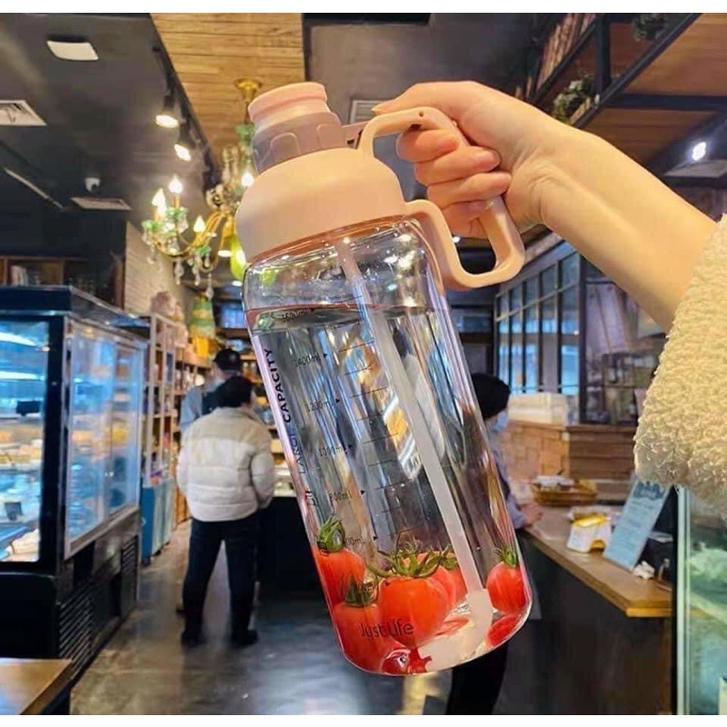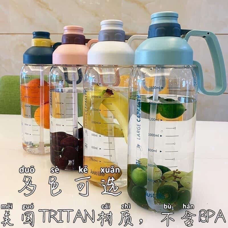 Bình nước nhựa 1800ml có chia vạch kèm ống hút tiện dụng