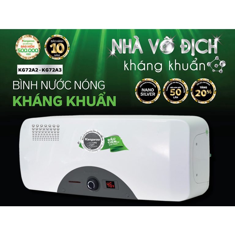 Bình nước nóng kháng khuẩn Kangaroo KG72A2 Nhà vô địch kháng khuẩnCông nghệ kháng khuẩn được Kangaroo áp dụng trên sản phẩm Bình nước nóng KG72A2 nhờ vào lớp nano bạc lên thanh nhiệt, giúp tăng độ bền của thanh nhiệt lên gấp 50 lần, các phân tử bạc sẽ phát huy tác dụng diệt khuẩn trên diện rộng trong suốt quá trình đun nóng. Theo các chuyên gia kỹ thuật của Kangaroo, công nghệ nano bạc tối ưu bởi nó là chất vô cơ, không gây ảnh hưởng đến thành phần của nước, không bị bào mòn trong suốt quá trình sử dụng nên có tác dụng trọn đời đối với sản phẩm.