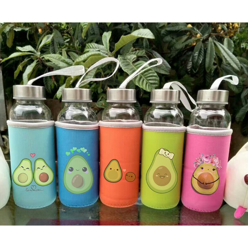 Bình nước quả bơ thuỷ tinh có dây xách BNVI8 chai nước hoạt hình bọc vải cute dễ thương 350ml