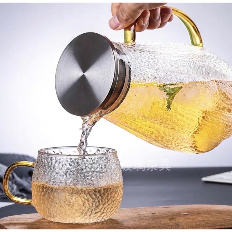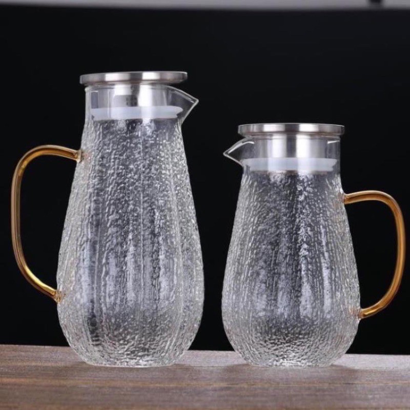 Nhà cửa & Đời sống > Bộ đồ bàn ăn > Bình nước & phụ kiện || Bình nước sần 1,6L thuỷ tinh Borosilicate chịu nhiệt nắp inox quai vàngCòn hàng