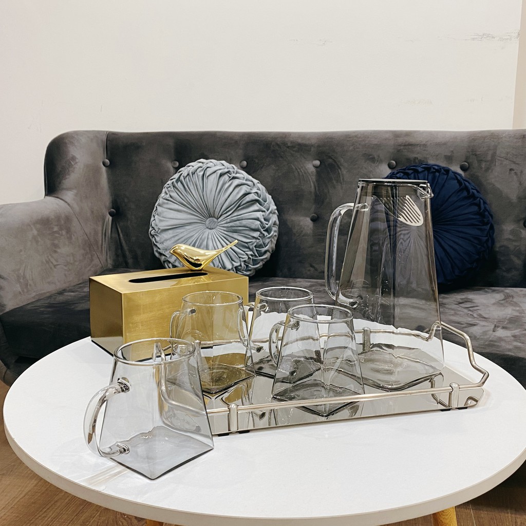 Bộ gồm: 1 khay hợp kim tráng gương, 1 bình, 4 cốc ( hoặc 6 cốc )