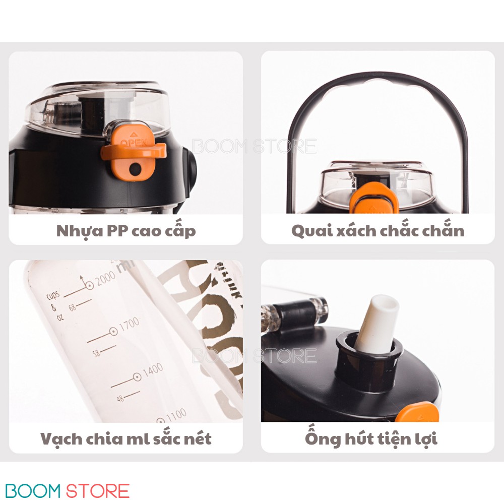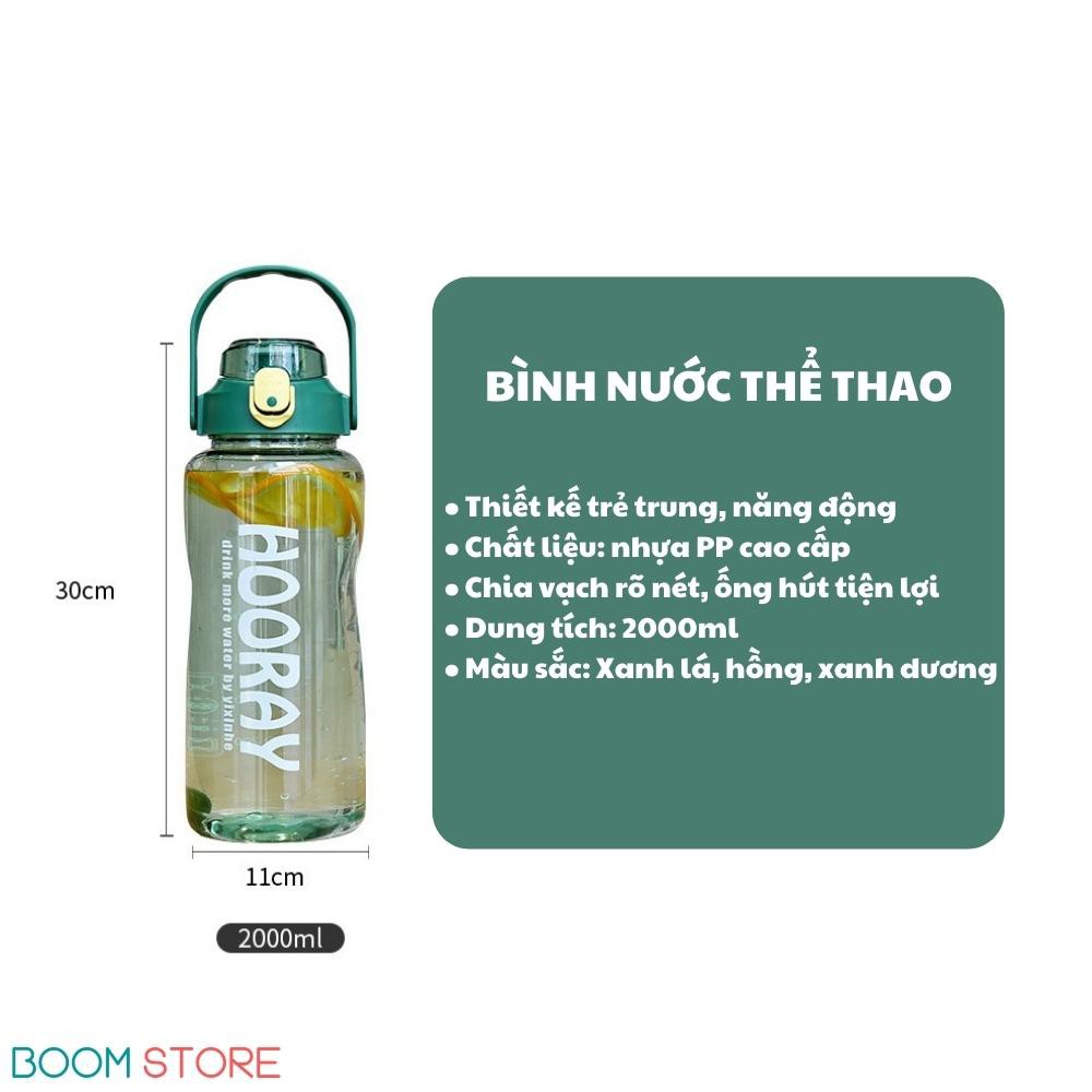 Bình nước thể thao 2 lít chia vạch có ống hút bằng nhựa cute Boom Store
