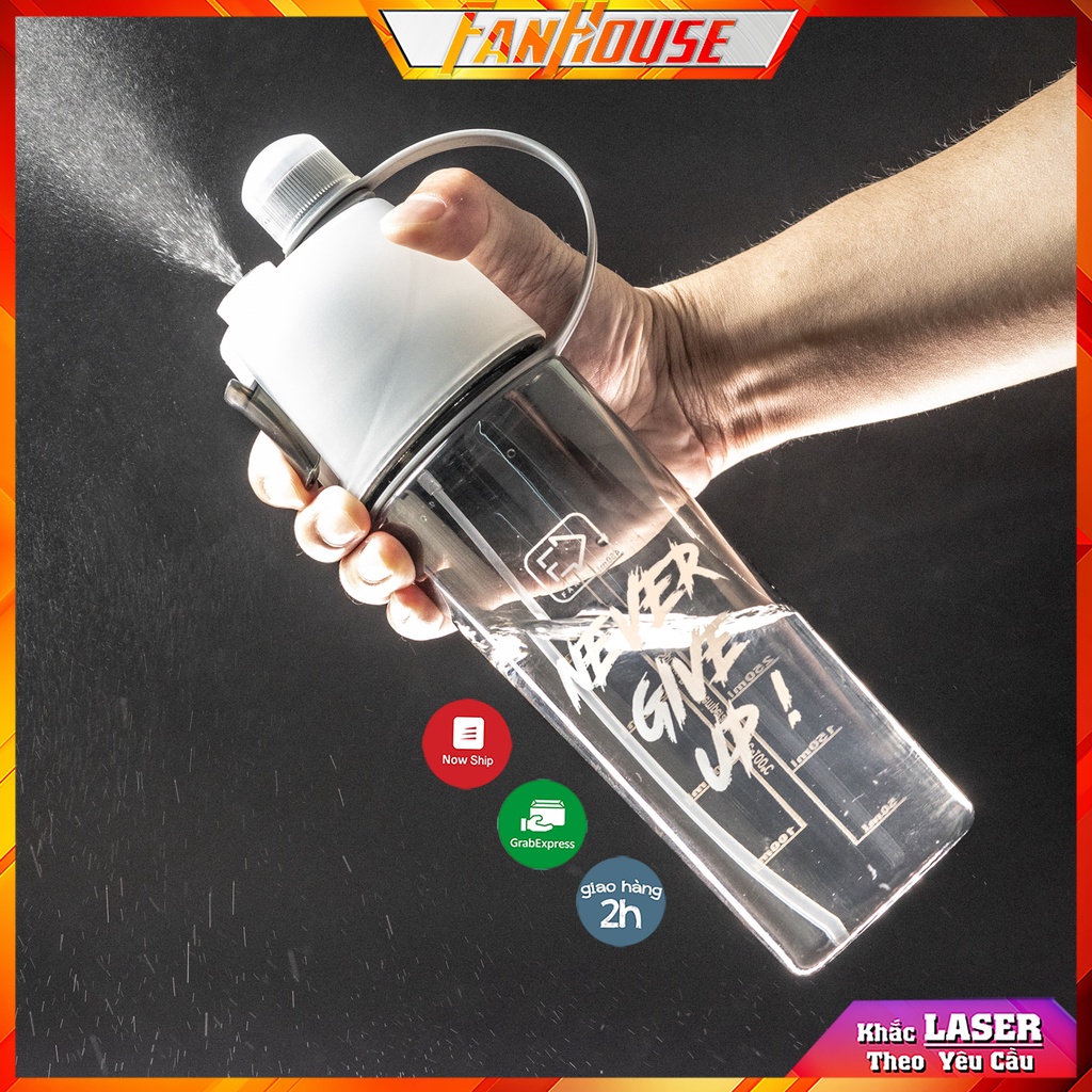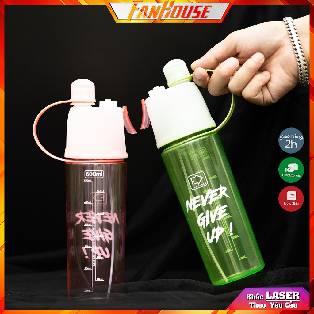 Nhà cửa & Đời sống > Bộ đồ bàn ăn > Bình nước & phụ kiện || Bình nước thể thao xịt khoáng FanHouse bình nước đa năng Never Give Up 600ml chia vạch ml phun sương làm mátCòn hàng
