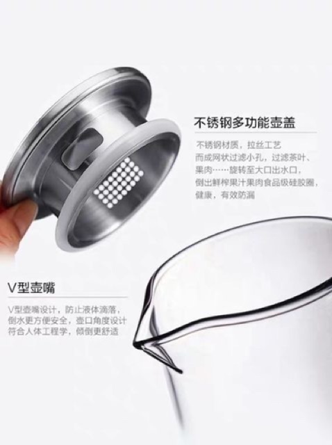 Bình nước thủy tinh chịu nhiệt được làm từ thủy tinh cao cấp có thể chịu nhiệt từ 200*C 400*c nên bạn có thể để vào ngăn đá hay đổ nước nóng trực tiếp vào bình mà không lo vỡ nứt như các loại thủy tinh thông thường. Đặc biệt nắp làm bằng inox cao cấp 304 chống hoen gỉ được thiết kế có phần lỗ lưới để ngăn bã trào ra khi bạn muốn pha trà hay nước detox, kèm theo đó là miếng nệm cao su được bo theo nắp sẽ dính chặt vào bình, không còn tình trạng rót nước bị văng nắp ra ngoài nữa.Hàng cao cấp nên các chị em cứ mua đi đảm bảo không hối hận đâu