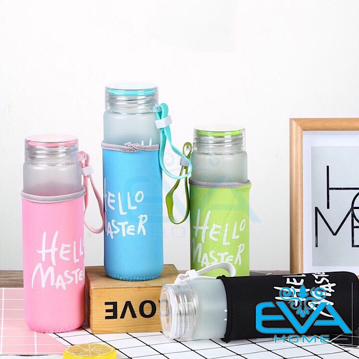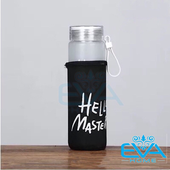 Bình Nước Thủy Tinh In Chữ Hello Master 480ML có dây xách Kèm Võ Bọc Vải NeopreneMã Sản Phẩm : 0023001153