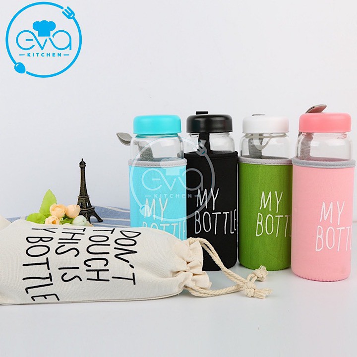 Giới thiệu Bình Nước Thủy Tinh In Chữ My Bottle Kèm Vỏ Bọc Vải Neoprene Và Túi Vải Dây Rút Nhiều Màu 500ml