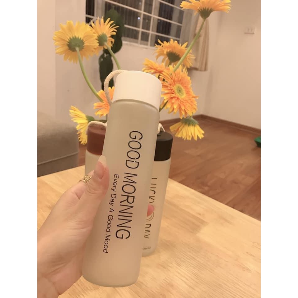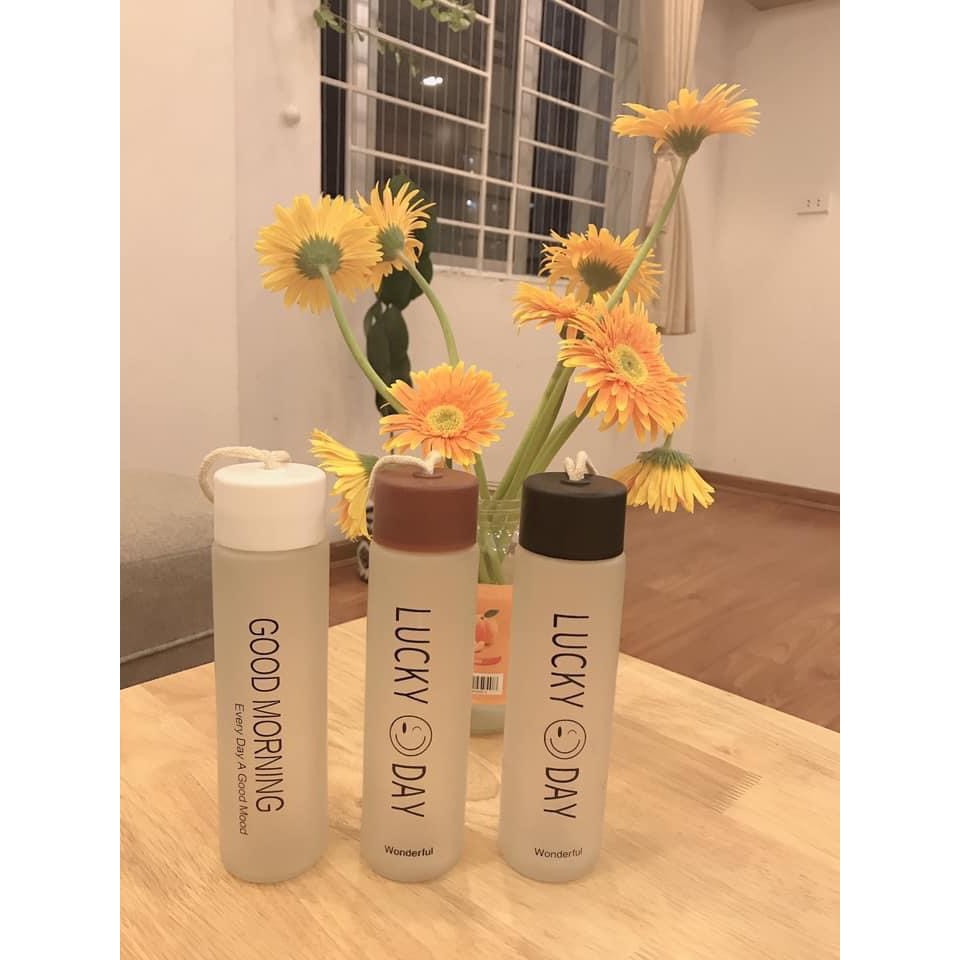 ✔️Với thiết kế đơn giản bình thủy tinh nhám có in chữ LUCKY DAY. GOOD MORNING... đủ màu và nắp nhựa có ron chất liệu cao su bạn hoàn toàn an tâm khi tiếp xúc với thức uống, hoàn toàn không chảy nước khi bạn để nghiên bình