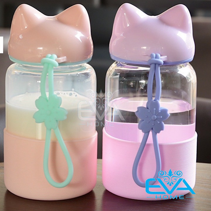 Bình Nước Thuỷ Tinh Vỏ Bọc Silicon Nắp Hồ Ly Dễ Thương 300 Ml