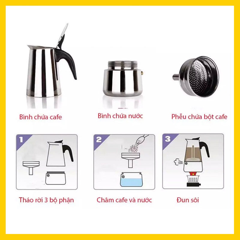 Moka Pot Express hoạt động bằng cách đun sôi nước lấy áp suất đẩy cà phê thơm nóng lên phần trên, giúp bạn thưởng thức một cốc cà phê vào mỗi sáng mà không tốn quá nhiều thời gian, chỉ mất 3-5 phú đun bạn sẽ có 1 ly cà phê thơm ngon đậm đà hương vị với cách thức pha truyền thống nước Ý.Dung tích 6 cup tương đương khoảng 270ml