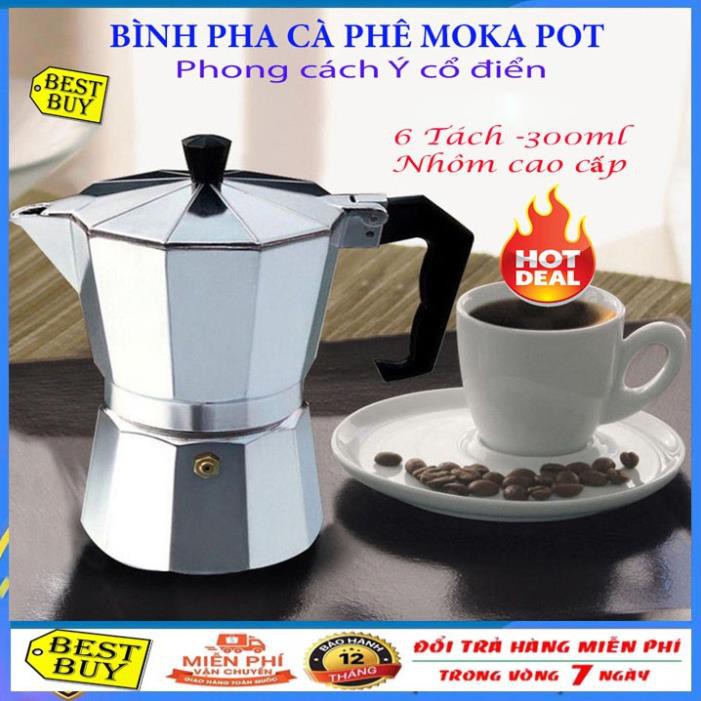 Bình pha cà phê Moka Pot 6 tách 300ml bằng Nhôm cao cấp - Bình pha cà phê kiểu Ý