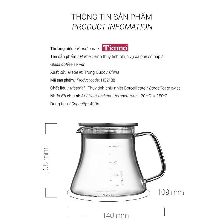 Tên sản phẩm: Bình pha cà phê thủy tinh chịu nhiệt Tiamo 400ml nắp inox- Công ty chịu trách nhiệm về hàng hóa: CÔNG TY TNHH CÀ PHÊ VOLCANO