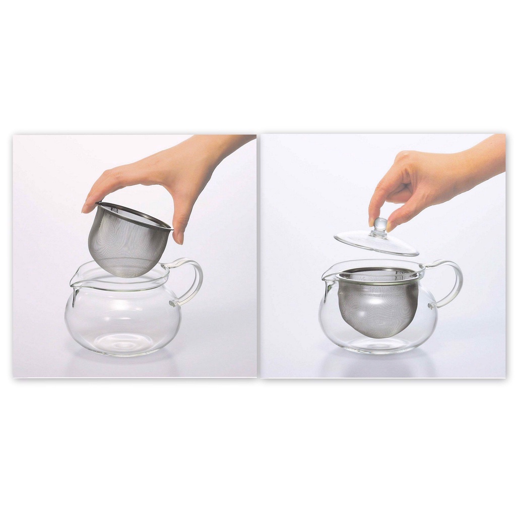 Bình thủy tinh chịu nhiệt cao (120 độ C). Có thể dùng được trong lò viba (trừ lưới lọc). Bình trong suốt, thấy được màu sắc của trà. Thiết kế khay lưới lọc trà lớn và miệng bình rộng dễ chùi rửa, vệ sinh. Núm nắp tròn dễ cầm. Nắp, thân bình: sản xuất tại Nhật Bản. Lưới lọc: Hàng Nhật gia công Trung Quốc.