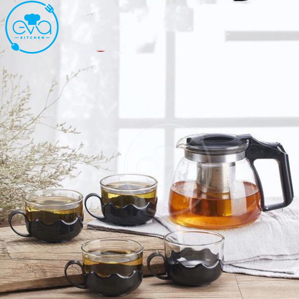 - Bộ Bình Lọc Trà Thủy Tinh Kèm 4 Tách Lưới Lọc Inox Không Gỉ Được làm bằng thủy tinh cao cấp không lẫn tạp chất có khả năng chịu được nhiệt độ trên 100 độ C.
