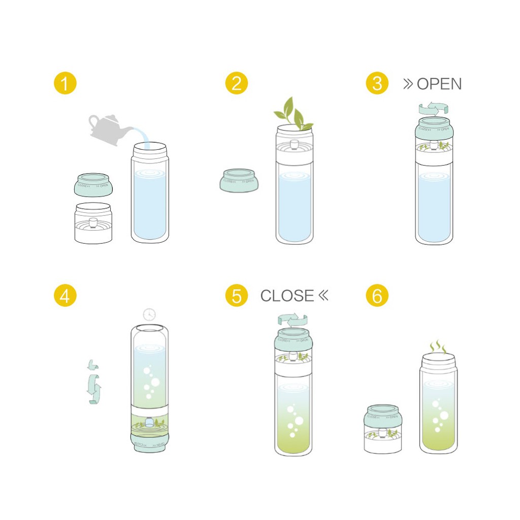 Bình pha trà Quance có thiết kế tích hợp khá độc đáo. Phần thân trà có thể được sử dụng như 1 bình nước độc lập, với phần trên là cốc pha trà, có lưới lọc trà được tích hợp bên trong. Bên cạnh đó thiết kế tách nước trà cũng là điểm nhấn của sản phẩm. Người dùng chỉ cần vặn nắp theo hướng OPEN để mở cốc pha trà, thì trà sẽ chảy ra và hòa với phần nước trong bình. Lúc này người dùng chỉ cần điều chỉnh lượng trà pha cho phù hợp với sở thích. Sau đó vặn nắp theo hướng CLOSE để đóng cốc pha trà lại. Lúc này người dùng chỉ cần mở nắp tách rời phần cốc đựng trà và thân bình và thưởng thức.