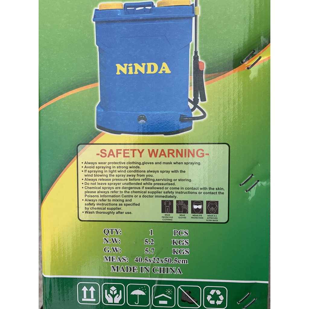 - Hiệu quả phun sương cực tốt, thiết kế nhỏ gọn nặng chỉ 5.7kg nên đeo vai nhẹ nhàng. Bình phun thuốc NiNDA có màu xanh. Thân bình chắc chắn, dày dặn. Mặt sau thiết kế các hạt Massage giúp đeo không bị đau lưng