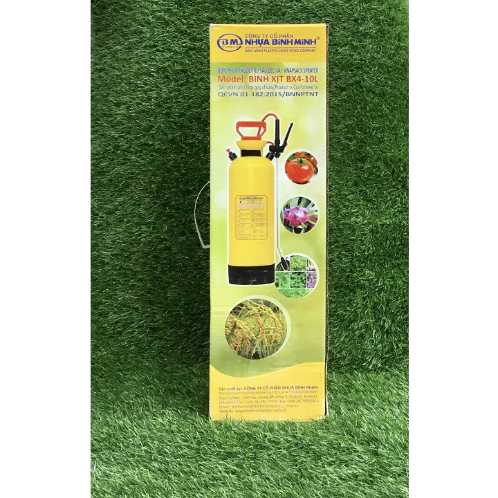 Bình phun xịt tưới 10L Bình Minh là sản phẩm thuộc công ty CP nhựa Bình Minh. Đây là đơn vị hàng đầu trong lĩnh vực sản xuất bình xịt ống và phụ tùng ống nhựa, mũ bảo hiểm lao động và các sản phẩm nhựa kỹ thuật khác; được chứng nhận ISO 9001:2000.