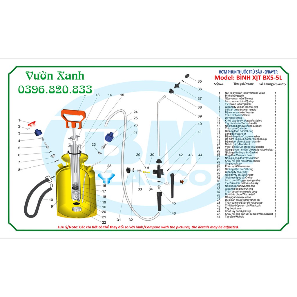 Cách sử dụng: Bơm nén khí; phun bằng cần phun. Đầu phun điều chỉnh phun sương, phun tia mạnh nhẹ, tùy chỉnh để phù hợp với từng loại cây.