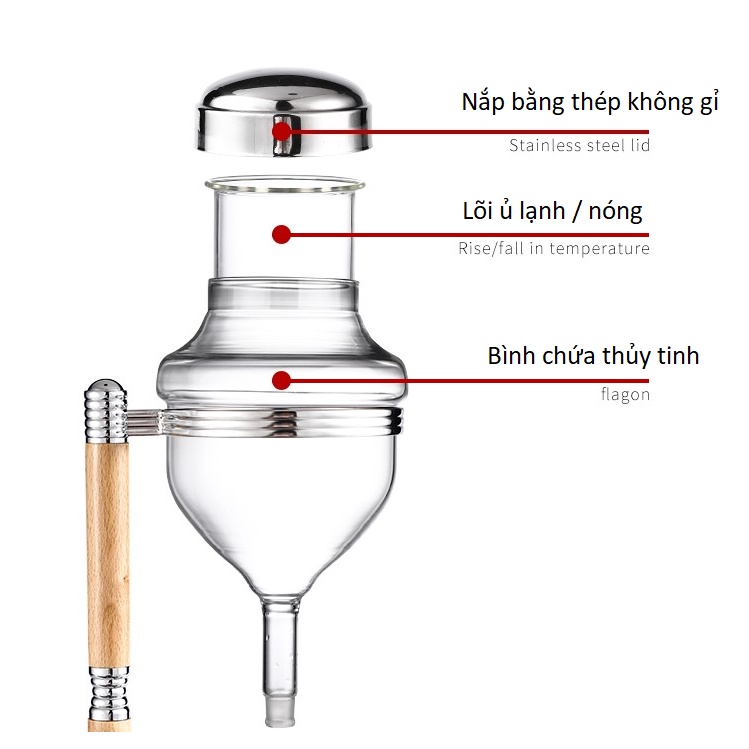 Bộ gồm: 1 bình đựng, 1 lõi đựng đá hoặc nước nóng, 1 lõi để pha trà, 1 cốc rót và 4 ly uống.