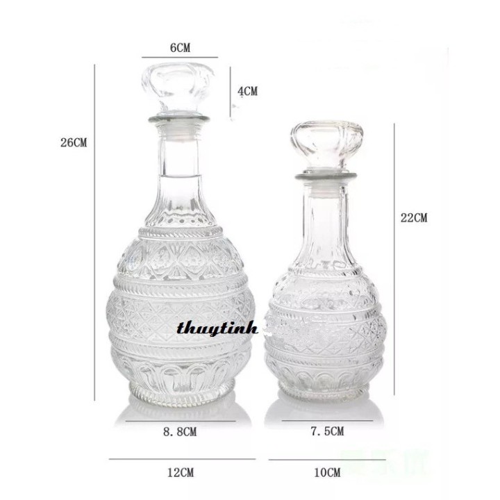 Độ dày bình thủy tinh hơn 5 li, kiểu dáng rất sang trọng, như bình rươu bầu, đầu nắp thủy tinh hình tròn bầu họa tiết kim cương lập thể, thân bình bầu tròn có hoa văn và khắc họa tiết sọc caro có hoa văn, thiết kế kiểu dáng cao cấp tạo hình cao quý sang trọng, thủy tinh trong suốt.