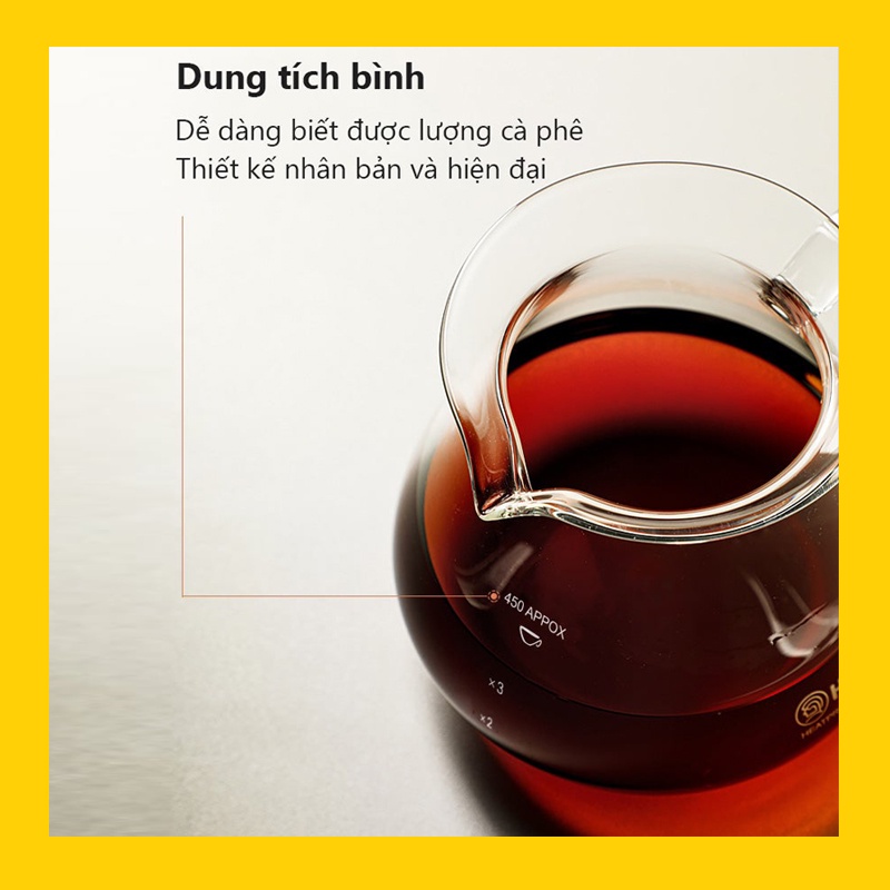 Bình có Tay cầm chắc chắn, cách nhiệt tốt, Trên thân có các mức để bạn lo lường lượng cà phê khi pha chế.