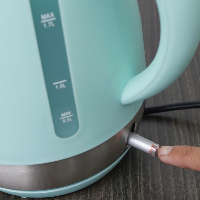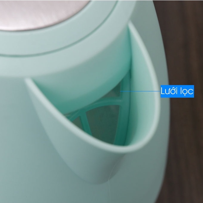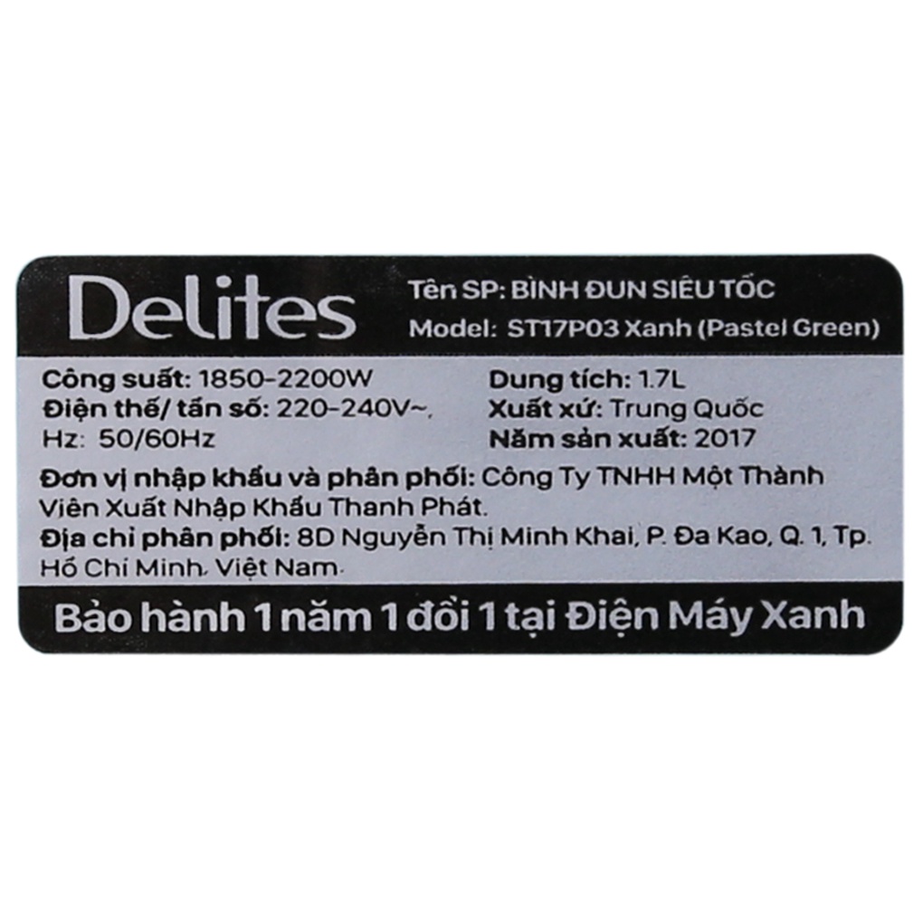 ● Bình đun siêu tốc Delites ST17P03 Xanh với màu xanh ngọc nhã nhặn, bắt mắt, công suất 1850 - 2200 WMâm nhiệt phẳng giúp dẫn nhiệt tốt, đun nước sôi nhanh, chỉ trong 5 – 7 phút.
