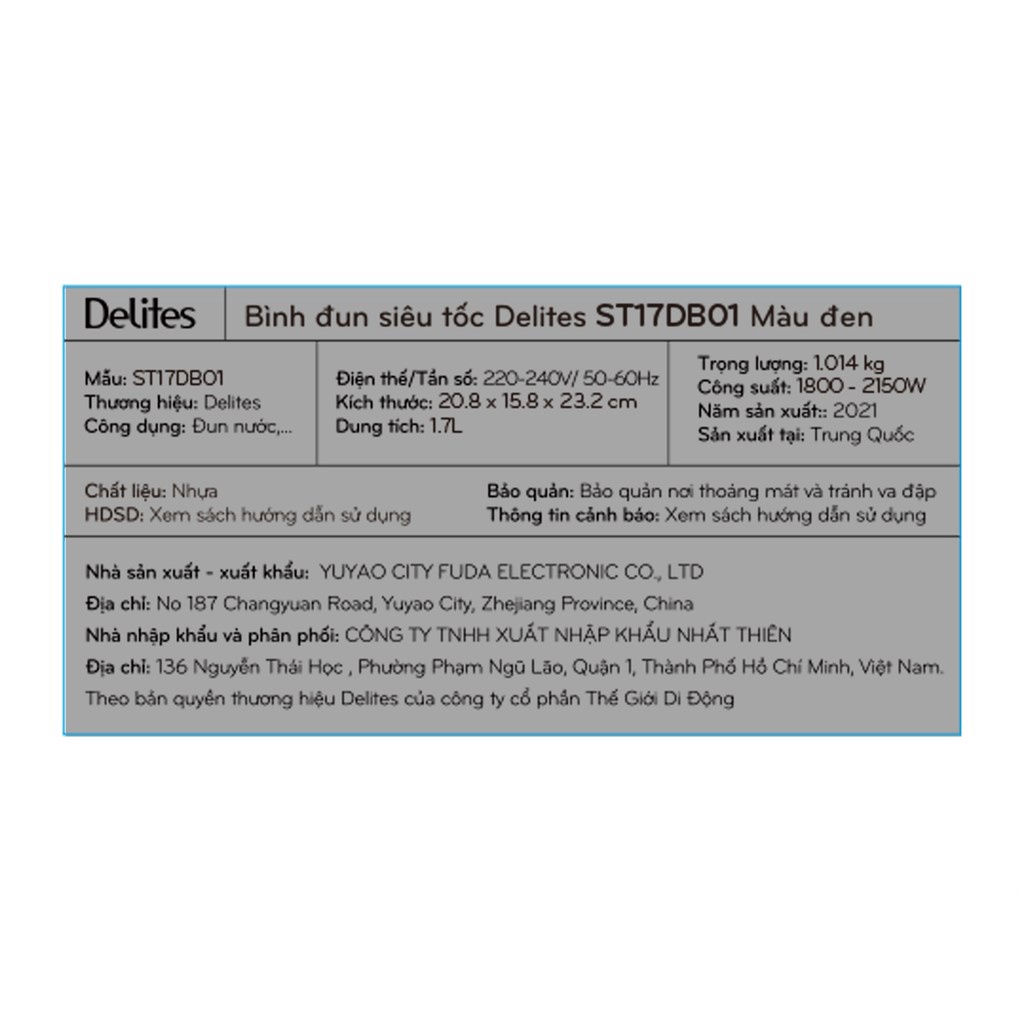 Giới thiệu [Mã ELHADEV giảm 4% đơn 300K] Bình siêu tốc Delites 1.7 lít ST17DB01 Màu Đen