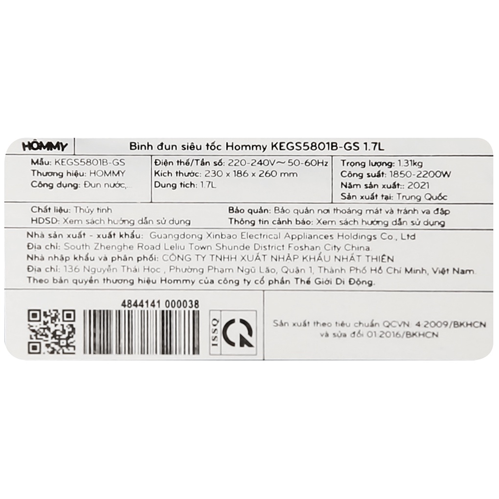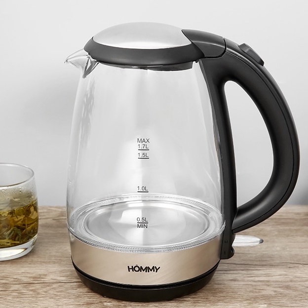 Bình đun siêu tốc Hommy 1.7 lít KEGS5801B-GS chất liệu thủy tinh chịu nhiệt cao cấp, an toàn với tính năng bảo vệ khi khô nước và tự ngắt khi nước sôi, đế xoay nhiệt 360 độ tiện lợi trong việc đun nấu, là thiết bị phù hợp dùng cho gia đình và văn phòng nhỏ.