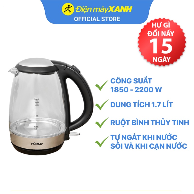 ● Chất liệu ruột bình bằng thủy tinh chịu nhiệt tốt, an toàn cho sức khỏe, có thể quan sát tình trạng nước bên trong, dễ vệ sinh.● Bình đun siêu tốc Hommy có dung tích 1.7 lít phù hợp dùng cho gia đình 3 - 4 người.