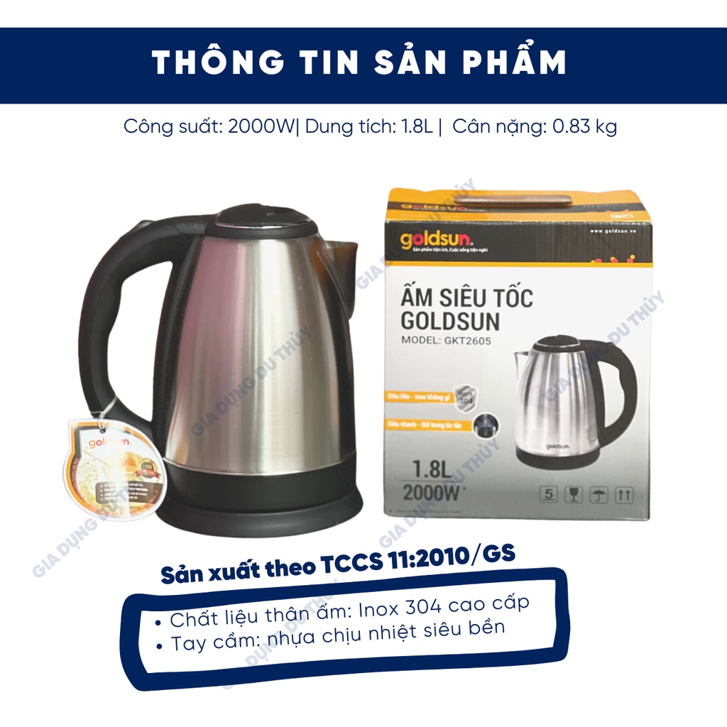Thiết Bị Điện Gia Dụng > Đồ gia dụng nhà bếp > Ấm đun siêu tốc || Bình siêu tốc inox 304 Goldsun dung tích 1.8L model GKT2605, nấu nước sôi nhanh trong tích tắc của gia dụng Du ThủyCòn hàng