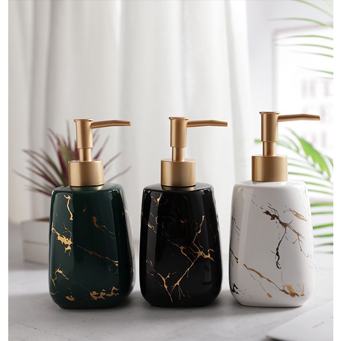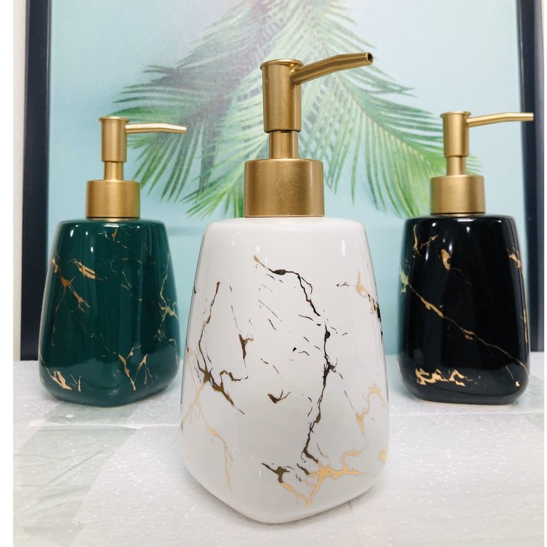 => Không chỉ tiện lợi trong việc lấy dầu gội, sữa tắm, nước rửa tay mà bình sứ men mạ vàng mạ bạc còn tạo điểm nhấn sang trọng cho phòng tắm nhà bạn.
