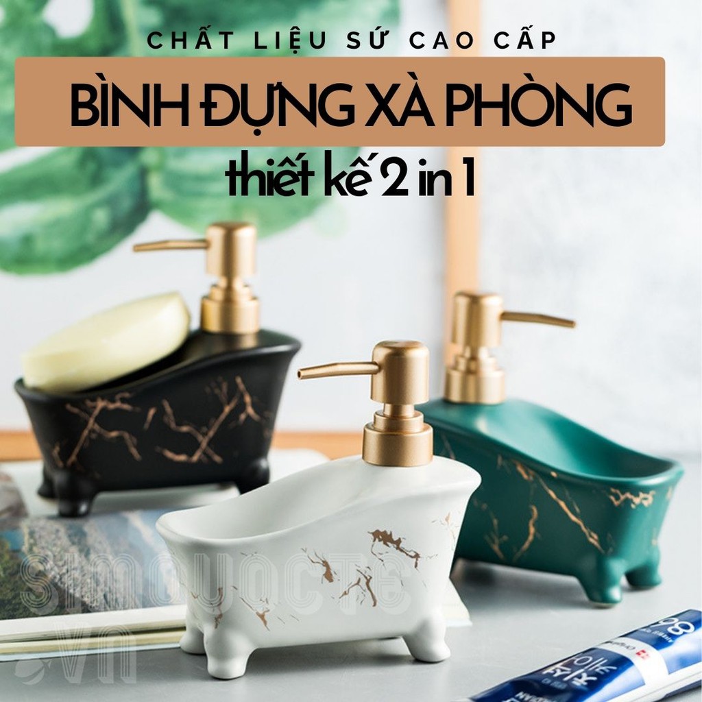 Bình sứ đựng xà phòng sữa tắm, dầu gội, nước rửa tay vân đá thiết kế 2in1