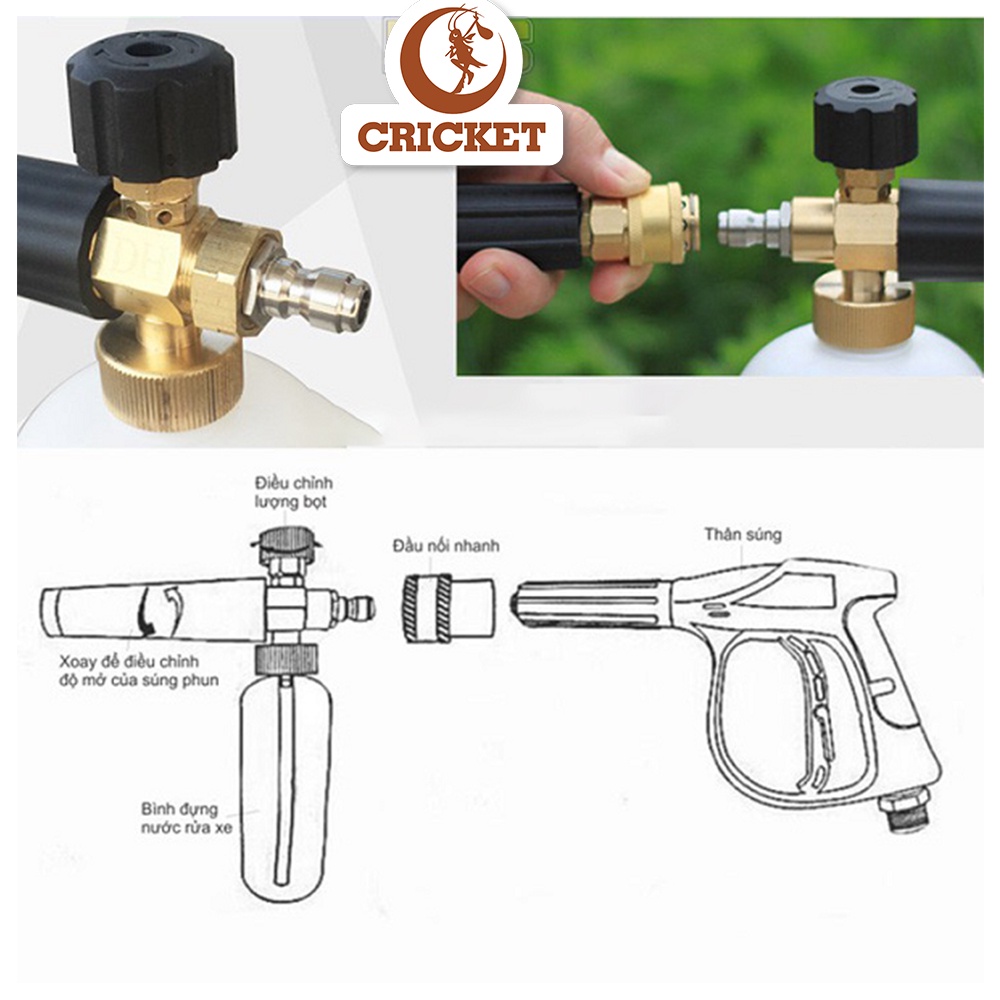 - Bình tạo bọt tuyết gắn dụng cụ phun rửa xe: đây là loại bình phun bọt tuyết mini có dung tích nhỏ, được gắn trực tiếp vào súng phun của vòi xịt. Model này thường được dùng cho quá trình phun rửa tại gia hoặc một số tiệm rửa xe máy quy mô nhỏ.