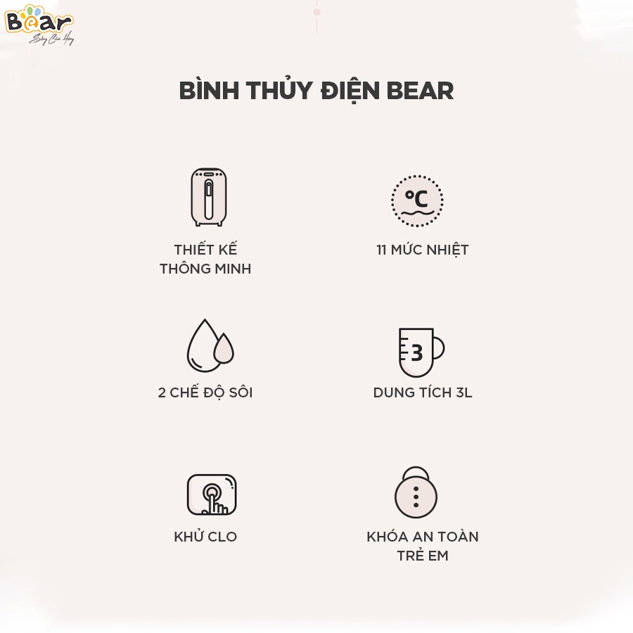 Bình Thủy Điện Bear 3 Lít H30B1 - đun nước giữ nhiết Công Nghệ Nhật Bản - Hàng Chính Hãng Bảo Hành 18 Tháng☑️ Bình Thủy Điện Bear 3 Lít H30B kết hợp tính năng của bình đun nước điện và bình thủy thông thường, vừa có khả năng đun sôi vừa giữ ấm nước tự động với công suất lên đến 1350W. Ruột bình có dung tích 3L làm bằng thép không rỉ, vừa tiện dụng vừa đảm bảo an toàn cho người tiêu dùng. Tích hợp nhiều tính năng ưu việt, thiết kế đơn giản và tinh tế, Bình Thủy Điện Bear 3 Lít H30B1 là lựa chọn hoàn hảo dành cho các chị em phụ nữ hiện đại.