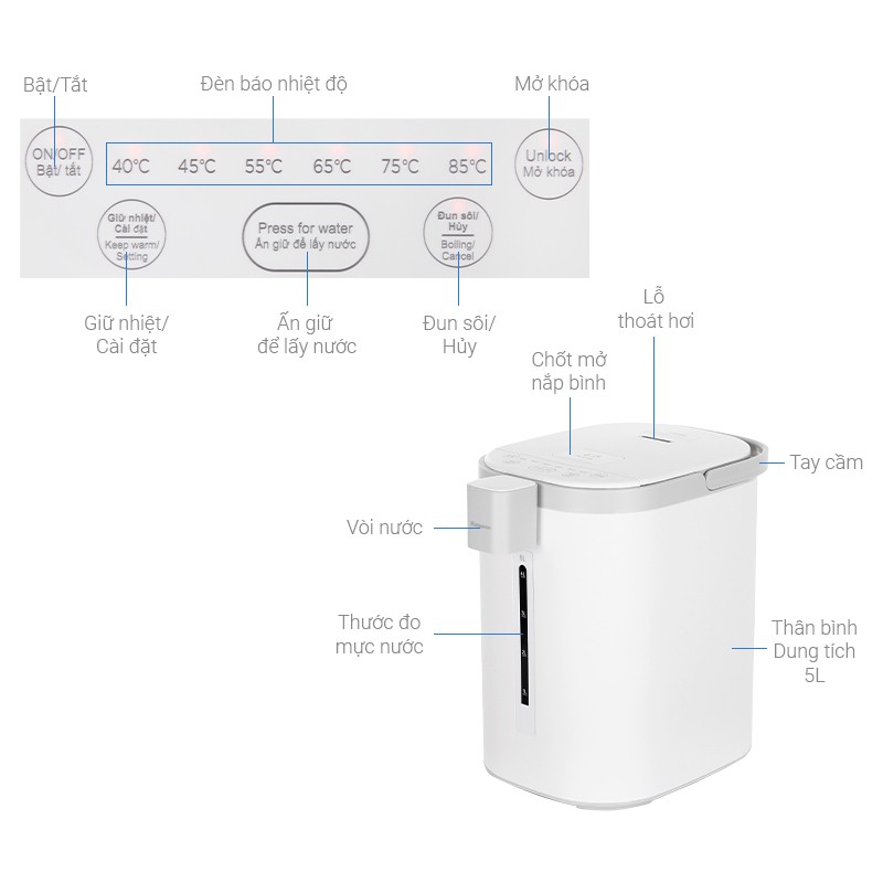 Bình thủy điện có thể đun sôi và giữ ấm nước tới 6 mức nhiệt: 85, 75, 65, 55, 45, 40 °C