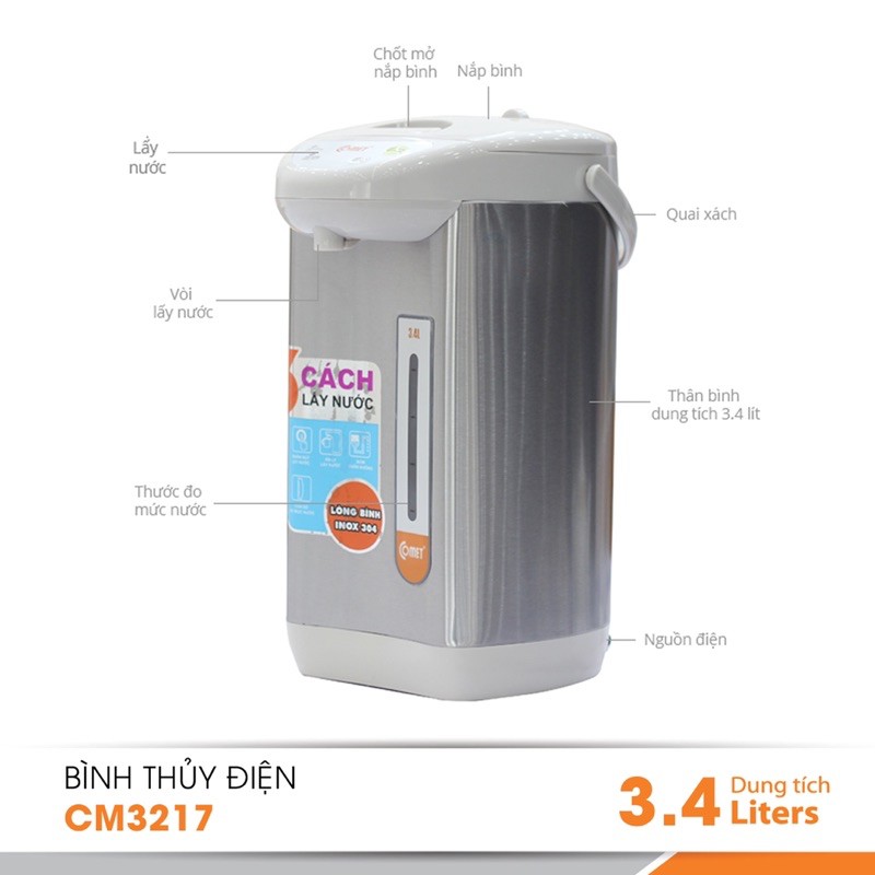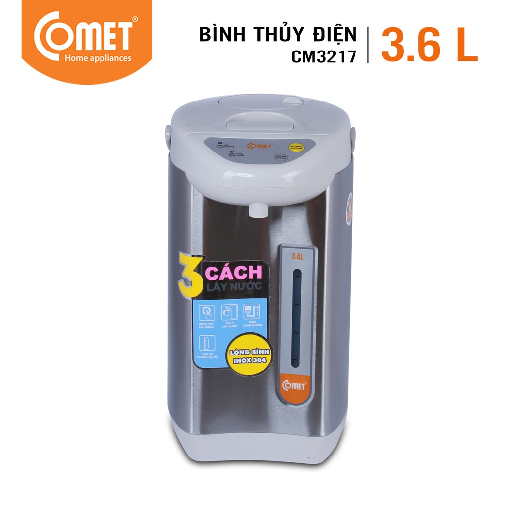 - Bình thủy điện Comet CM3217 dung tích 3.4 Lít với ruột bình bằng thép không gỉ (SS 304) an toàn cho sức khỏe, dễ dàng vệ sinh sau khi sử dụng. Trang bị bảng điều khiển bằng tiếng Việt dễ dàng khi sử dụng.