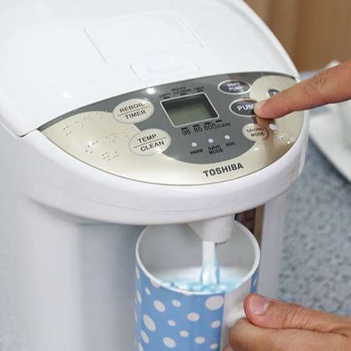 - Bình thủy điện Toshiba PLK-45SF(WT)VN tự động ngắt điện khi ấm cạn nước, tránh tình trạng đun sôi khô. Sau khi tự ngắt an toàn, bình sẽ phát chuông báo hiệu và đèn nhấp nháy liên tục để thông báo người dùng châm thêm nước. Khóa trẻ em sẽ ngăn bơm điện tử hoạt động, tránh việc các bé bị bỏng do nghịch phá.