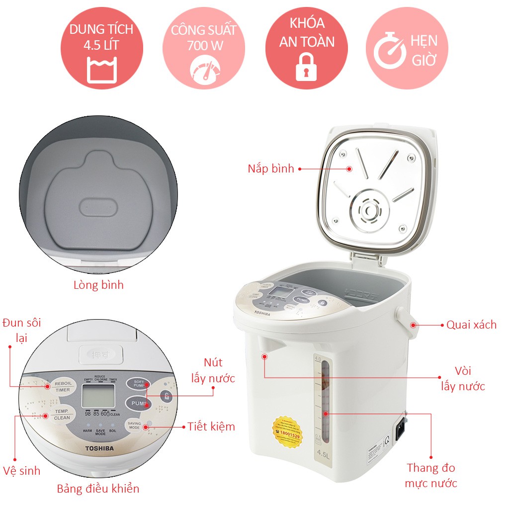 - Bình thủy điện Toshiba PLK-45SF(WT)VN mang thương hiệu Toshiba uy tín đến từ Nhật Bản, đảm bảo sự hài lòng tuyệt đối cho người sử dụng
