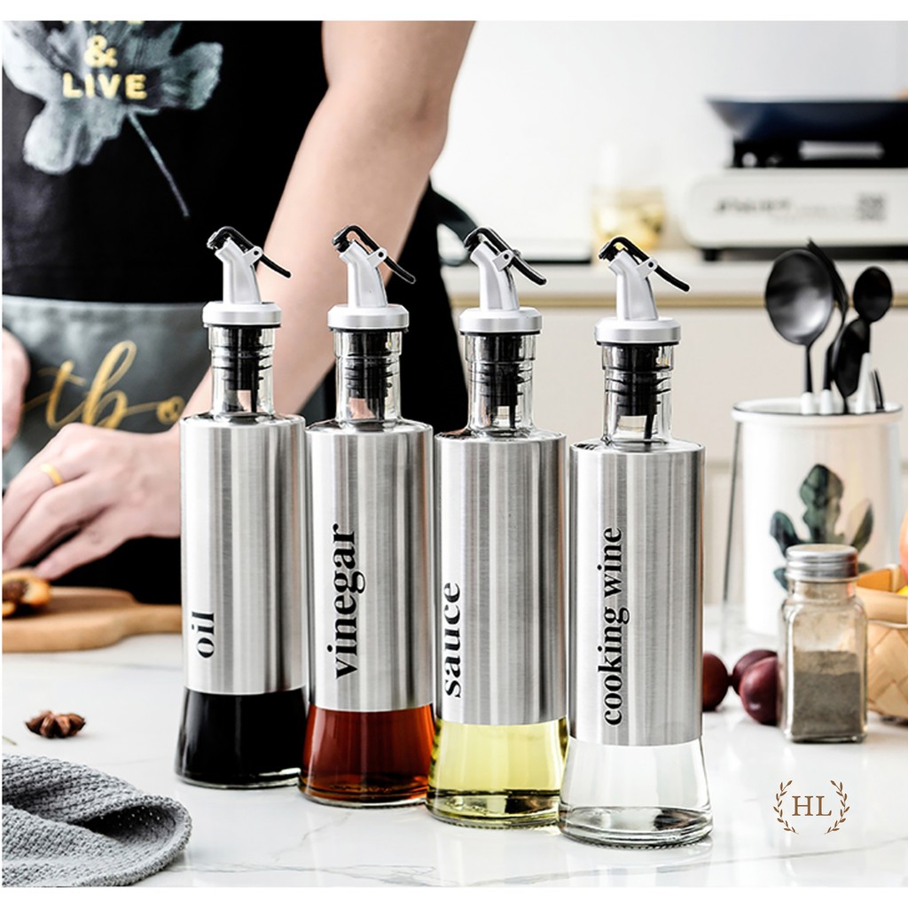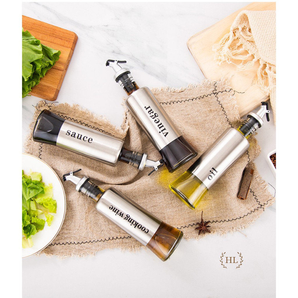 Bình thủy tinh bọc inox đựng dầu ăn, giấm, nước tương, nước mắm, gia vị... có vòi chiết rót thông minh hạn chế quá tay