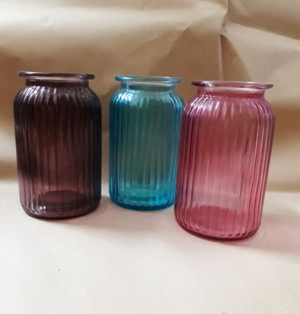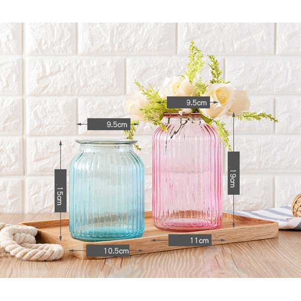 Bình thủy tinh cắm hoa dáng trụ có vân nổi sọc dọc nhiều màu sắc trong suốt theo phong cách Châu Âu thanh lịch.Bình thích hợp để cắm hoa tươi hay hoa giả. Với chút kéo léo, bạn có thể quấn thêm sợi dây thừng gai, ruy băng trang trí thêm cho bình thêm đẹp, thêm điểm nhấn.
