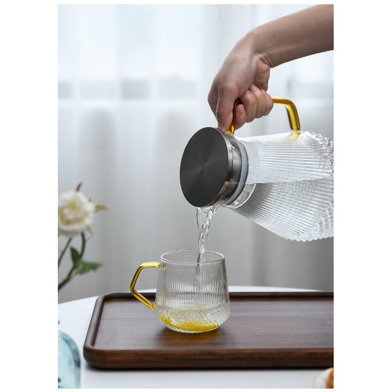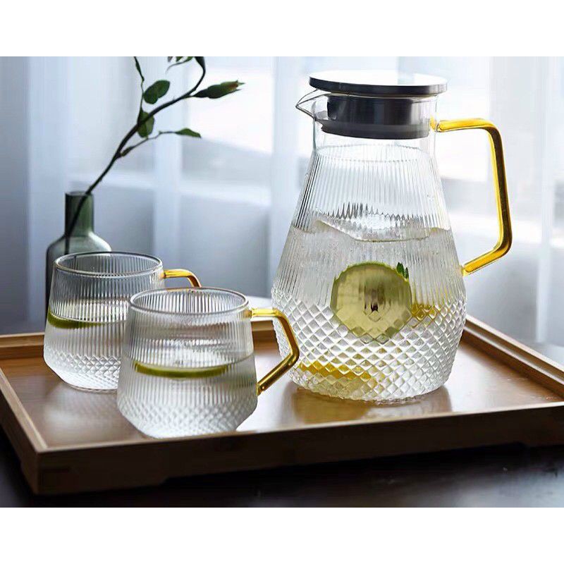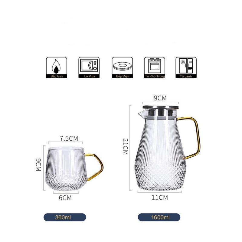 Bình đựng nước thủy tinh quai vàng, Bình pha trà thủy tinh chịu nhiệt mã HB05 là sản phẩm có tính thẩm mỹ cao và tiện ích cho mọi gia đình. Sản phẩm nổi bật bởi thiết kế hiện đại đầy tinh tế với chất liệu chính là thủy tinh cao cấp bền, sáng bóng và trong suốt. Chất liệu này còn bảo đảm an toàn vệ sinh, sức khỏe cho mọi thành viên trong gia đình suốt quá trình sử dụng.- Bình có thể tích 1.6Lít thủy tinh trong suốt, Ly thủy tinh 320ml chịu nhiệt cao, bảo đảm an toàn vệ sinh.