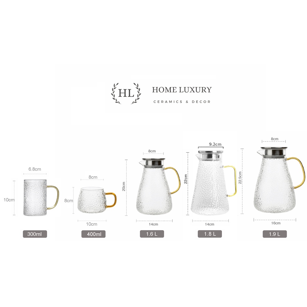 Bình thuỷ tinh chịu nhiệt sần quai vàng | Bộ bình cốc thủy tinh sần Borosilicate chịu nhiệt, chịu lực cao cấp