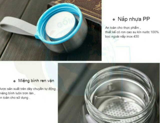 + Bình nước được làm bằng thủy tinh cao cấp, trong suốt, chịu nhiệt, nắp thiết kế sáng tạo, nắp vặn có khoang chứa trà vô cùng tiện lợi giúp bạn mang đi mọi nơi.