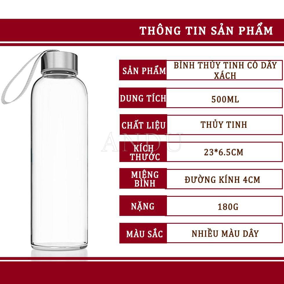 Thông số Bình Thủy Tinh Đựng Nước Có Dây Xách:Dung tích: 500ml
